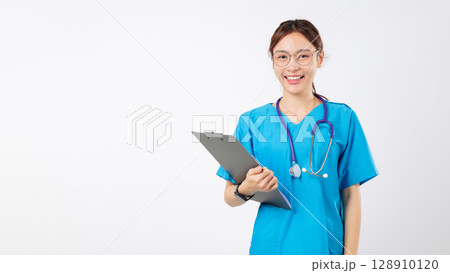 Smiling Asian woman doctor, healthcare medical worker in uniform with stethoscope, glasses holds clipboard as friendly nurse, suitable for clinic ads, cheerful female nurse, isolated white background