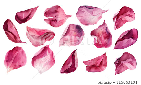 Set of isolated deep pink rose petals in watercolor painting style on a transparent background.