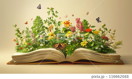 an open book with vibrant flowers, plants, and butterflies emerging from its pages