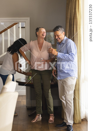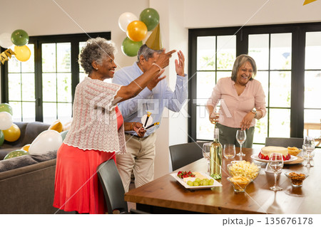 Happy biracial senior woman celebrating with friends at christmas dinner in sunny dining room