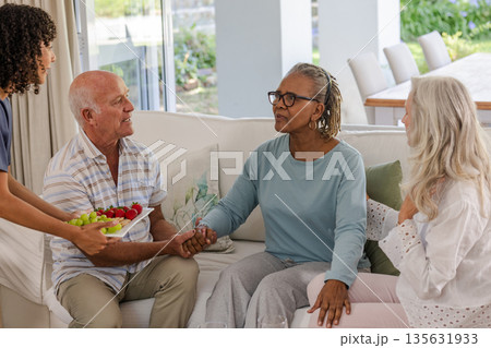 Senior friends enjoying conversation and sharing fruit at home, smiling warmly