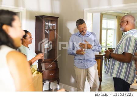 Senior friends enjoying drinks and conversation at home, sharing joyful moments