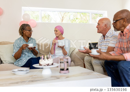 Senior friends enjoying coffee and cake while chatting in cozy living room