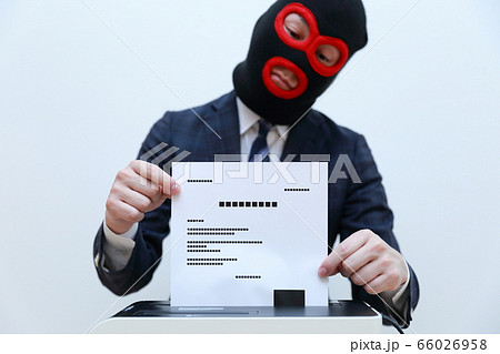 シュレッダー (犯罪者 隠蔽 顔なし コピースペース 人物 電化製品 スーツ 男性 怪しい 危険)