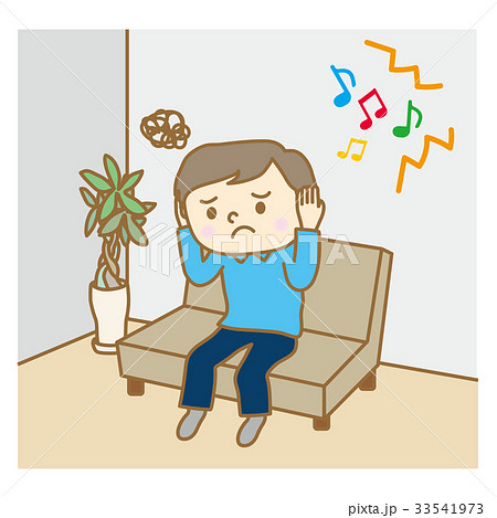 隣の部屋の騒音に困惑する男性のイラスト