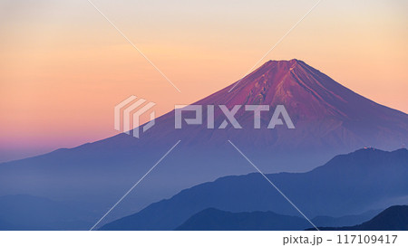 (山梨県)雁ヶ腹摺山から見る富士山と山並み・朝焼けの景色