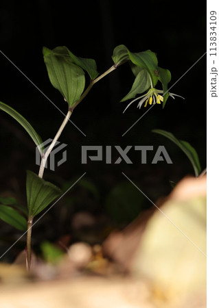 自然 植物 チゴユリ、春から初夏に大きめの葉に隠れて下向きに咲く花。上から見ると見逃すかも