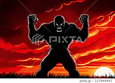 夕焼けに染まる空で雄たけびを上げるマッチョな男のシルエットのイラスト