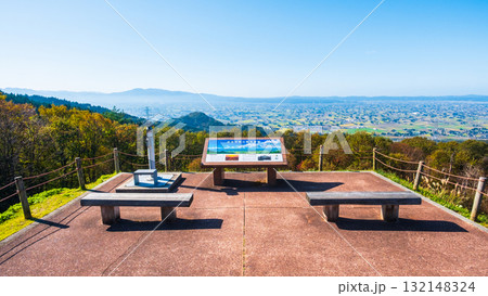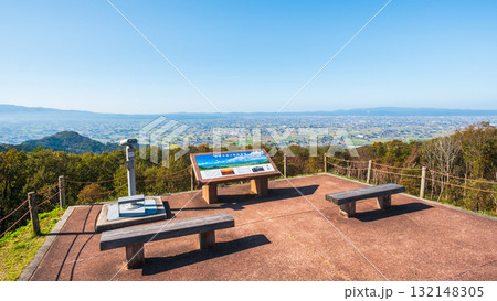 熊本県阿蘇市 秋の大観峰へ向かう阿蘇のカルデラの中にある駐車場に停車中の黄色い大型バス
