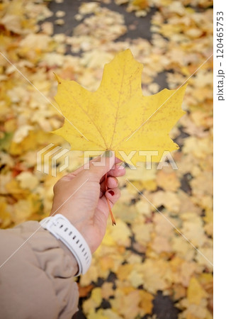Autumn maple leaf in hand in park in sun. Natural autumn background. Foliage, falling leaves