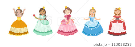Cute Little Girl Princess in Pretty Dress with Crown on Head Vector Set