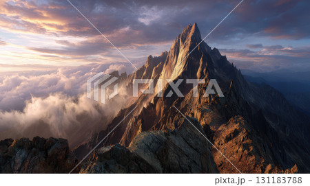 Remote mountain peak sunrise clouds below sharp ridge dramatic sky landscape