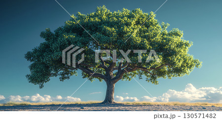 A vibrant, full-grown oak tree with dense green foliage and a sturdy brown trunk stands on a patch of grass against a clean white background.