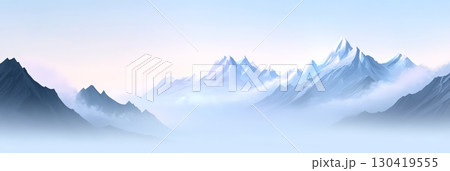 Low hanging clouds gently embrace majestic snow capped mountain peaks, creating a breathtaking vista of serenity and natural beauty during a tranquil sunrise