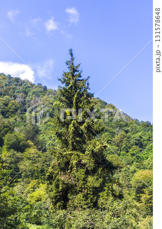 Blue spruce tree in a natural style, in blue and green colors, representing winter and coniferous forests