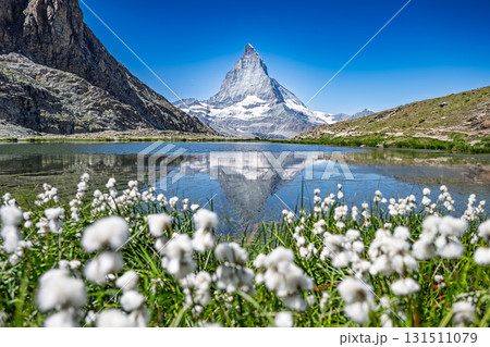 A woman standing on top of rocky mountain with Matterhorn mountain on sunny day at Switzerland