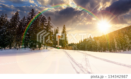 winter landscape with snow covered country road winding through fir forest in mountains at sunset. alpine countryside of in evening light. timeless nostalgia book cover with rainbow