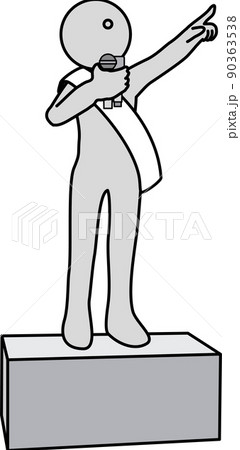 選挙に立候補して、マイクで演説するタスキをかけた男性のシルエット