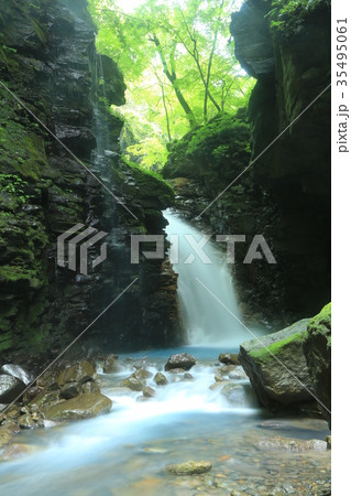 栃木県那須塩原市 新緑のスッカン沢の雄飛の滝