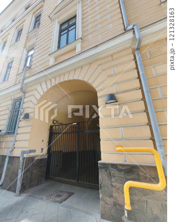 A beige neoclassical building facade with symmetrical windows and an arched gateway. The visible drainpipes and details reflect the practical and aesthetic aspects of urban architecture