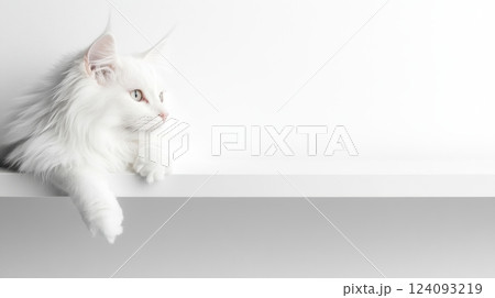 A beautiful white long-haired cat is perched on a white shelf or ledge against a light background. The cat's fluffy fur is pristine and gleaming, contrasting subtly with the clean white surroundings.