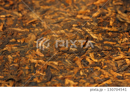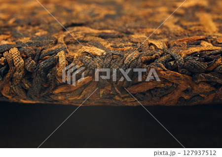 Close-up view of a puer tea cake reveals its intricate texture and rich color.