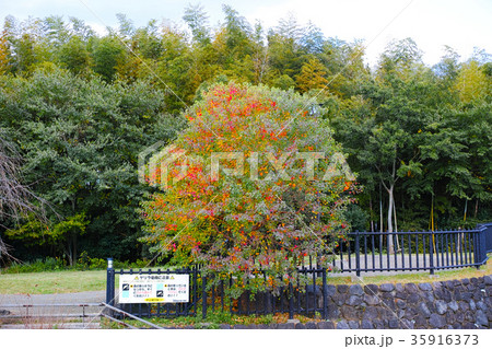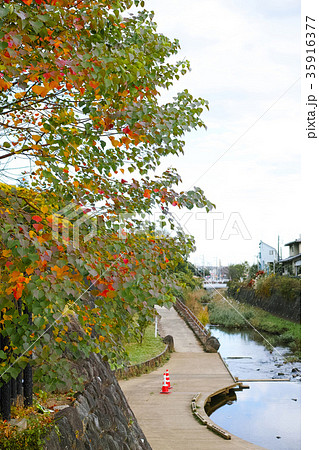 ナンキンハゼの木の紅葉と阿久和川