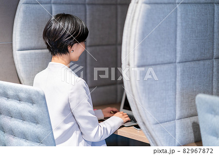 ワークブースでテレワーク中の若い女性 撮影協力「+SHIFT NOGIZAKA」