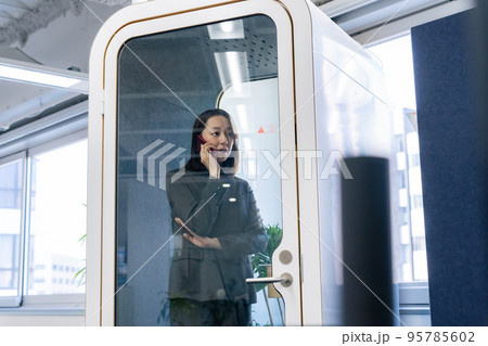 個室ワークブースで電話をかけるビジネスウーマン