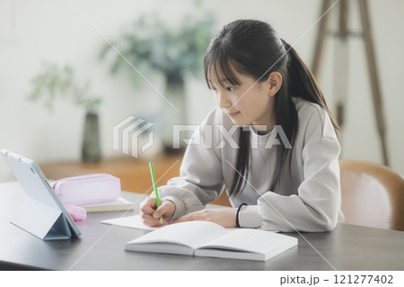 真剣な表情で勉強中の高学年男子