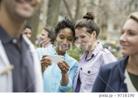 People outdoors in the city in spring time. New York City park. Two women in a group of friends, looking at a cell phone and smiling.