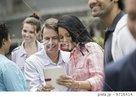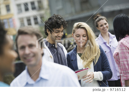 People outdoors in the city in spring time. New York City. A group of men and women, a couple in the centre looking at a digital tablet screen.