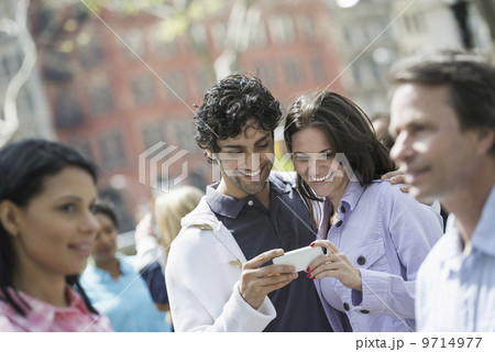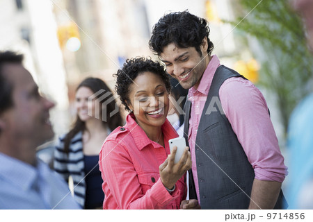 People outdoors in the city in spring time. New York City. A group of men and women, a couple at the centre looking at a cell phone.