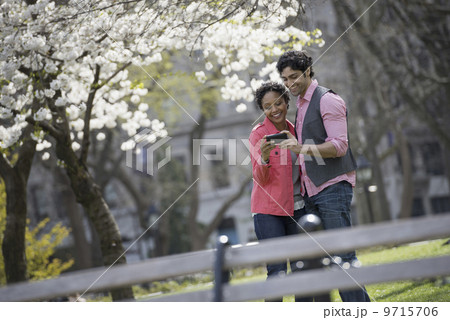 People outdoors in the city in spring time. New York City park. A man and woman side by side. Taking a photograph with a hand held cell phone.