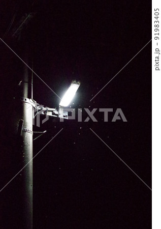 電柱に設置されたライトに多数の虫が群がっている夏の夜間の屋外の光景を高感度で撮影した画像