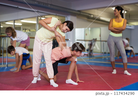 Girls and boys try to make painful grip on the attacker arm during training in self-defense lesson