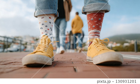 Adults wear mismatched socks while walking together to promote kindness and acceptance in their community