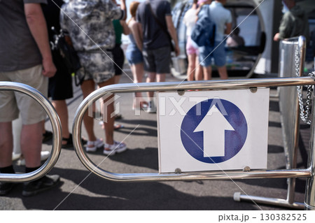 Diverse crowd with upward direction sign outdoors on sunny day