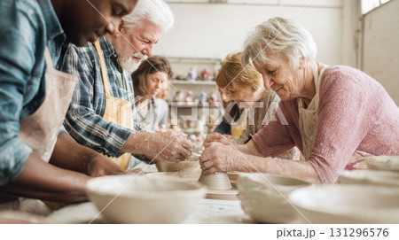 Seniors shaping clay in pottery workshop, enjoying creative group activity for active aging.
