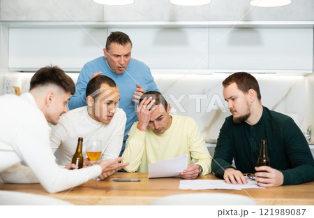 Men drink beer and try to help friend solve problems using laptop and Internet
