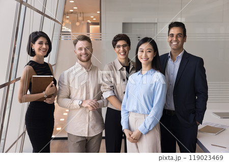 Standing together and smiling, multiracial schoolgirls posing for photo in classroom