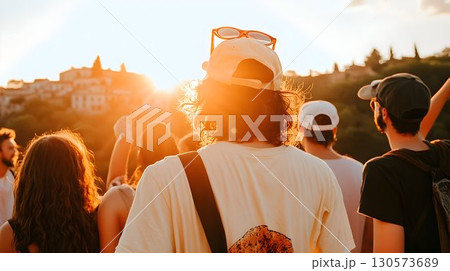 Golden Hour Crowd Admiring Cityscape with Sunglasses on a Cap