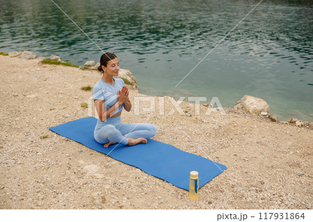 Experience Serenity by the Water Engaging in a Yoga Practice on a Beautiful Scenic Shoreline