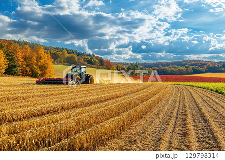 Tractor harvesting golden grains in a vibrant autumn field landscape, harvest season, blue sky