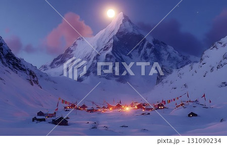Moonlit Mountain Village: Snow-Covered Peaks and Festive Flags a