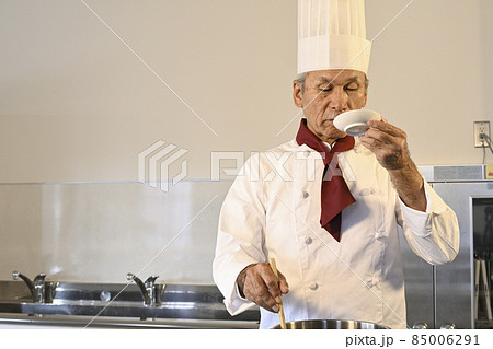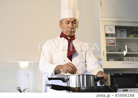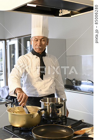 飲食店の厨房でコック服を着たシニア男性が料理を作る