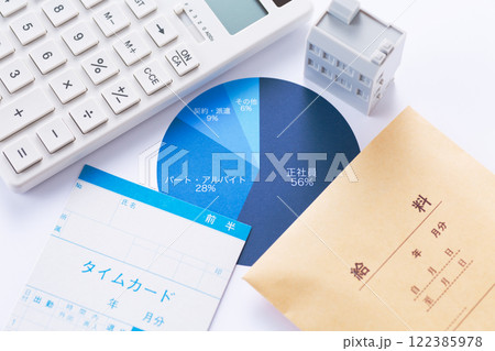 企業の雇用形態グラフと電卓と給料とタイムカード