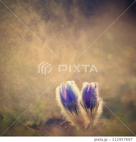 Spring flowers. Beautifully blossoming pasque flower and sun with a natural colored background. Detail of beautiful spring nature (Pulsatilla grandis)