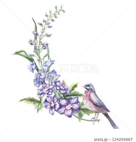 Curved composition with dilphinium flowers, caterpillar and bird. Isolated watercolor illustration of flowers in realistic style for textile design, printing on fabric and clothes, posters.
