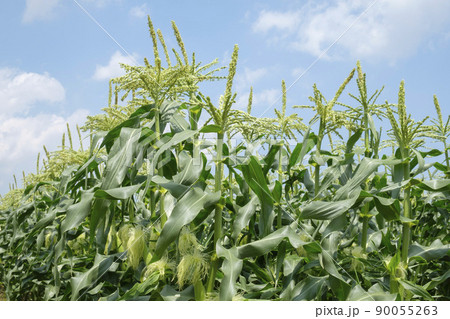 初夏のトウモロコシ畑の雄花と雌花
